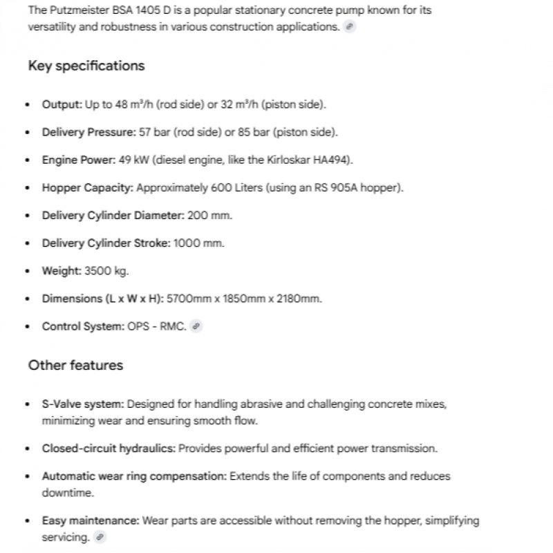 The Putzmeister BSA 1405 D is a stationary concrete pump with a capacity of 70 cum per hour and a delivery pressure of 85 bar on the piston side. It features a 49 kW engine, a 600-liter hopper, and is designed for demanding construction projects like high-rise buildings and infrastructure.