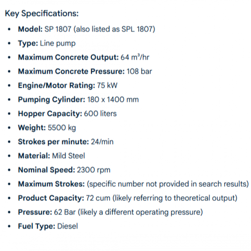 Here are some key specifications for the Schwing Stetter SP 1807:
