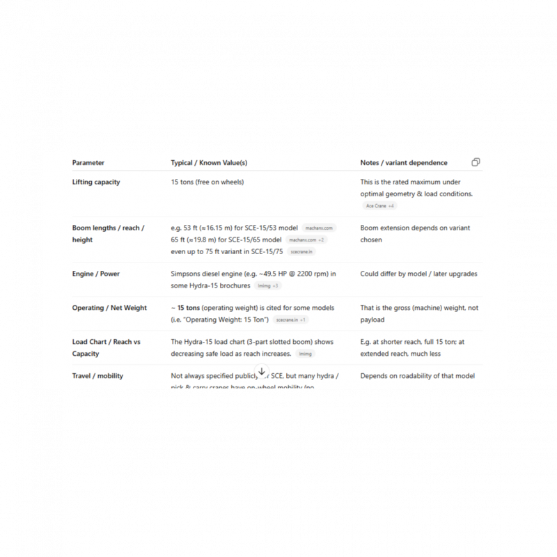 Here is a brief note and available specifications for the SCE Hydra 15 Ton crane (Hydra = hydraulic / pick-and-carry / mild-steel type). Note that exact specs vary with model variants (boom length, configuration), so consider this as a representative summary plus known options.