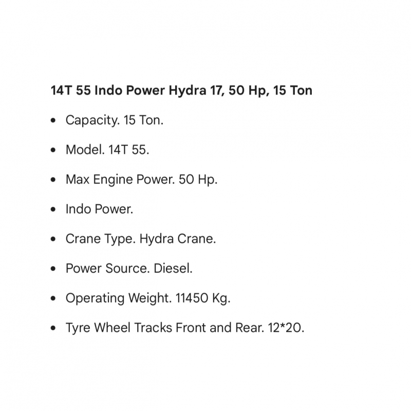The Indo Power 14T is a robust 14-ton pick-and-carry hydraulic mobile crane suited for heavy lifting tasks at construction and industrial sites. It boasts a ~60 HP BS-III diesel engine, a 3-part hydraulically telescoping boom that offers boom heights around 16.76 m, and a horizontal reach of about 13.6 m. It features powerful brakes, good maneuverability via articulated steering (≈ 7 m turning radius), and durable tyres. Rated at a speed of ~30 km/h when unladen, it balances reach, lifting capacity, and mobility well.