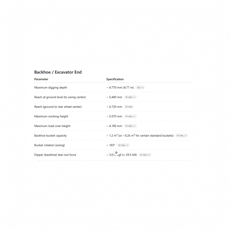 The JCB 2DX is a compact backhoe loader made for utility and light-to-medium construction tasks, especially in tighter or more constrained work zones. It features a modest 49 hp (36.4 kW) water-cooled diesel engine that balances fuel efficiency and power. On the front, it carries a loader bucket of about 0.55–0.60 m³ for loading, lifting, and material handling tasksThe backhoe arm can dig to a depth of approximately 3.02 mIts operating weight is around 5,220 kg (5.2 tons). The machine includes a 4-speed fully synchromesh transmission with torque converter and is built to be maneuverable and effective in both loader and excavator roles.