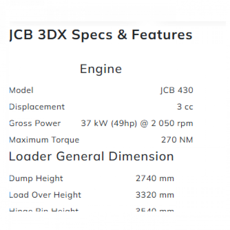 • Backhoe Bucket Capacity: Bucket ~0.14 m³ (5 cu ft)