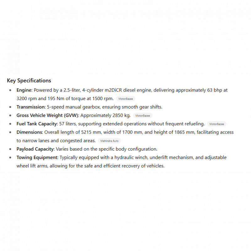 The Mahindra Bolero BS4 Toe Van is a versatile light commercial vehicle (LCV) engineered for efficient towing and roadside assistance operations. Built on the robust Mahindra Bolero platform, it combines utility with durability, making it ideal for urban and semi-urban environments.