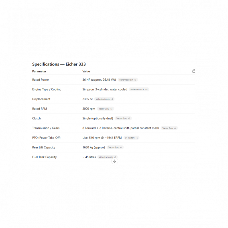 Eicher 333 is a reliable and efficient 36 HP tractor designed for small and medium-scale farming operations. It features a 3-cylinder engine that delivers strong performance with excellent fuel efficiency. The tractor offers smooth transmission, easy handling, and low maintenance costs, making it ideal for agricultural and haulage tasks.