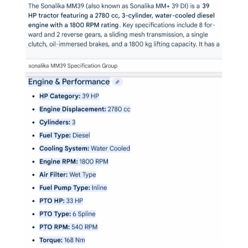 The Sonalika MM 39 is a 39 HP, 2WD (Two-Wheel Drive) tractor featuring a 2780 cc, 3-cylinder engine with a 55-liter fuel tank. It has a water-cooled engine, wet-type air filter, and a sliding mesh transmission with 8 forward and 2 reverse gears. The tractor offers 1800 kg lifting capacity, oil-immersed brakes, and is suitable for farm applications like cultivation, rotavator, and land leveling.