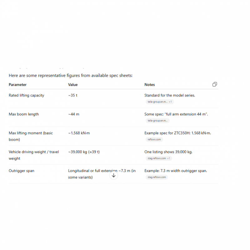 This class crane offers roughly 35 ton (≈ 32 tonne) rated lifting capacity, which places it in the medium mobile truck‐crane category. Key models include for example the ZTC350H series. One spec sheet lists it at 35 tons with a boom length ~44 m. These cranes are truck‐mounted (telescopic boom on a truck chassis) and built for reasonably strong lifting while still retaining mobility between sites.They are useful for building construction, plant/equipment installation, infrastructure work where full heavy-duty (100+ tonne) cranes may be overkill.